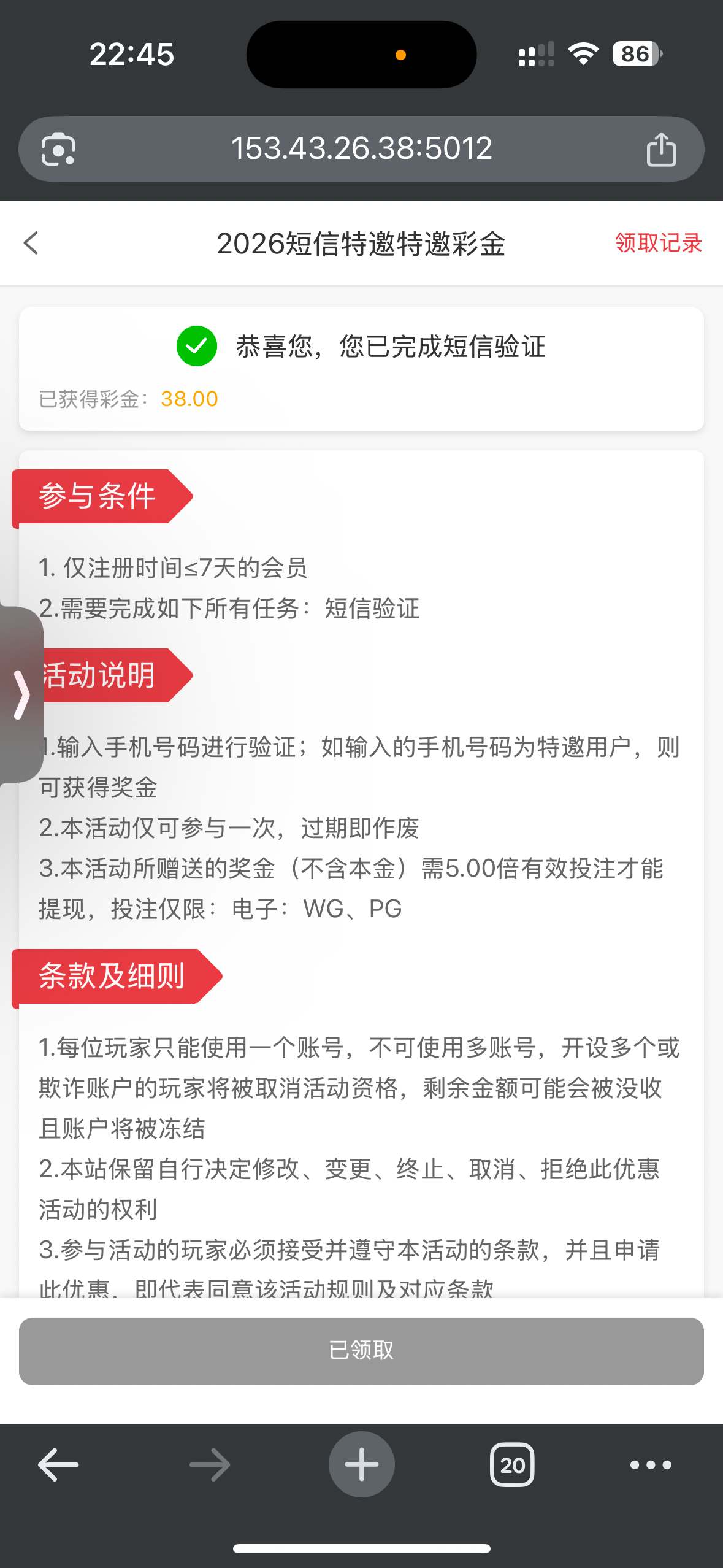 晚上收到的短信 刚才去试了一下有38 各位老哥可以去碰一下 刚领到我就来给大哥们发帖了还没打不知道能不能出